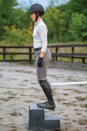 Unmounted Exercise 1: Stair Stretch. If you have trouble keeping your heels down, this exercise can make a big difference. Although Cadet Charlotte Hereford is demonstrating it here on a mounting block, it’s ideally done on stairs with a banister. Stand on the edge of a step with your heels hanging over the edge. Lightly rest one hand on the wall or railing if necessary to maintain your balance. Then, keeping your back straight, flex your ankles to allow your heels to drop below the level of the step. You should feel your calf muscles stretching. Hold this position for about 10 seconds, then step off the stairs and rest for a moment. Repeat this 10 times.