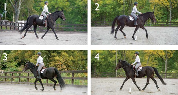 1. Matilda begins the exercise by riding down the long side of the arena in a posting trot. She then turns Aberdeen down the centerline, aiming for the middle of the poles. They arrive in a nice balance, but Matilda’s leg has slipped too far back. I’d also like to see her heel a little deeper and her hands slightly lower.