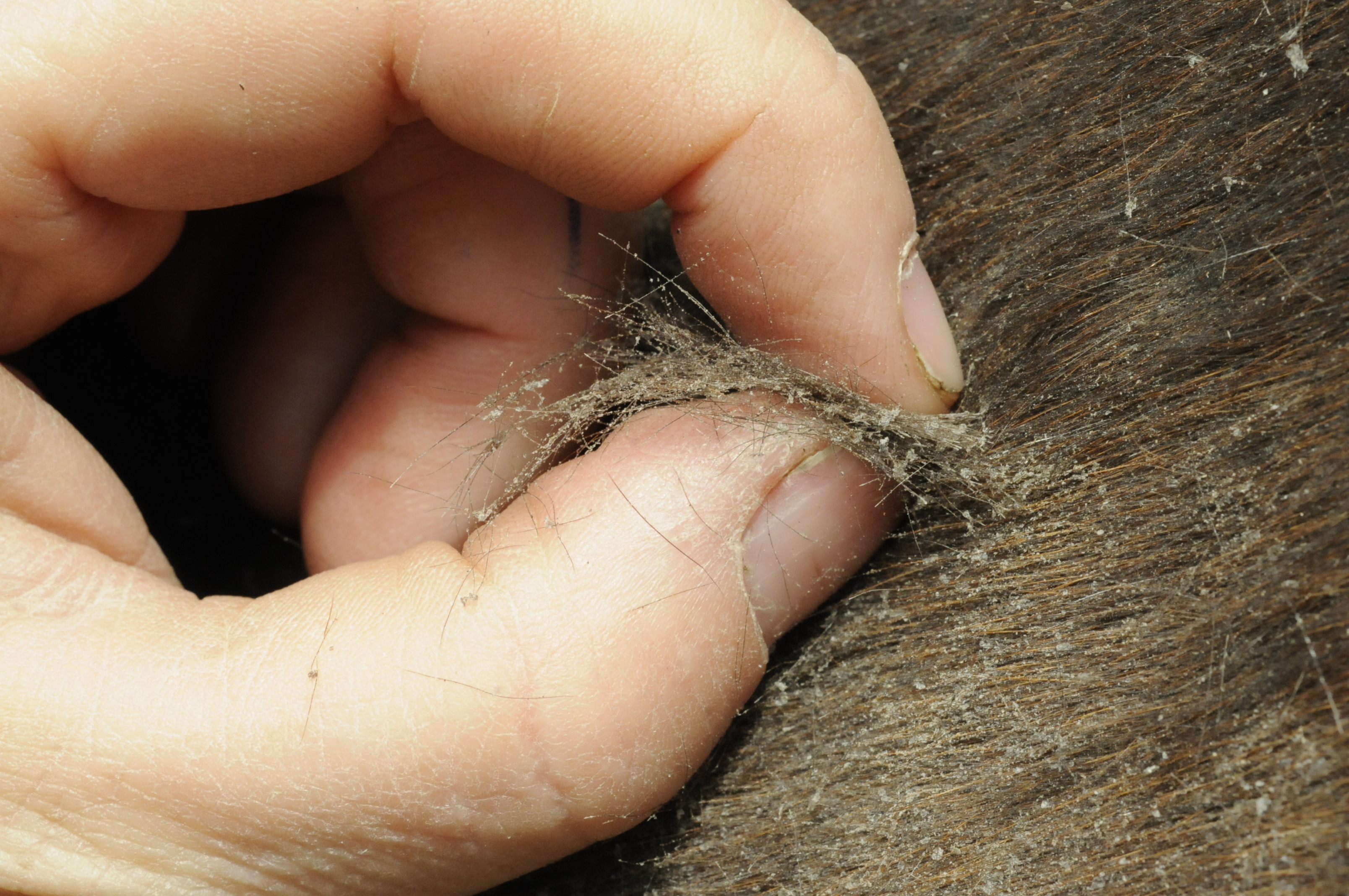 After a wet spring with frequent rain and the appearance of fiercely biting insects, you may notice your horse’s coat is not blooming quite as well as you would like. His skin is dry with loose, flaky hair, or worse, he’s been losing patches of hair when you groom him and the skin feels crusty when you run your hand over his back. These are signs of a common skin condition called dermatophilosis, often known as rain rot or rain scald.