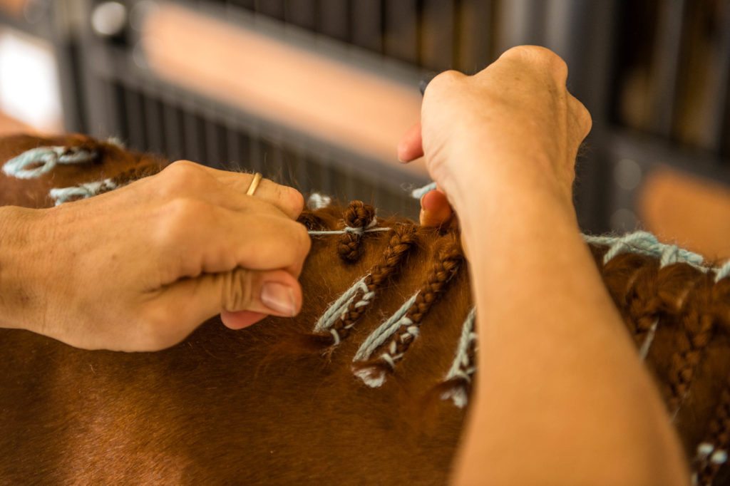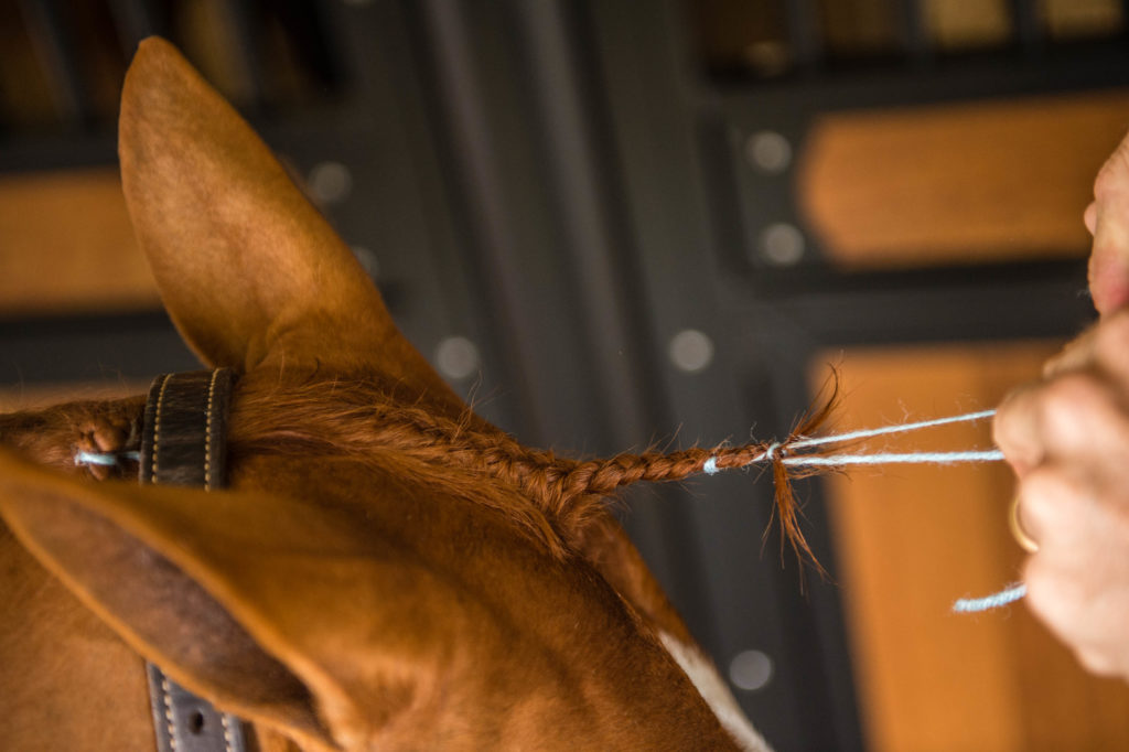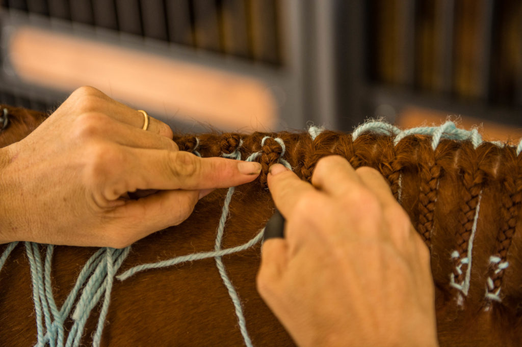 It’s also important to stay right in front of what you’re doing. As you braid, be careful you aren’t leaning to the side because unconsciously, you will make the braid crooked. Horses are always moving. It’s important that you move with them by moving your step ladder, not only to keep your braids straight but also so you aren’t putting unneeded strain on your own body, especially your back. Remember, braiding is all about practice. It might take many repetitions to get the feel for it.