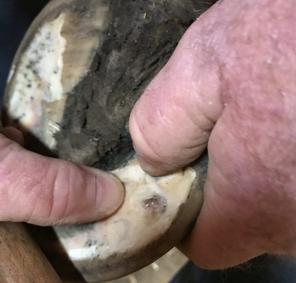 - an injured or diseased white line (the soft, fibrous inner layer of the hoof wall)