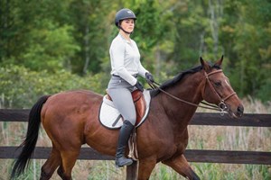 If you’re feeling comfortable sitting the trot without reins, try dropping your stirrups as well. Slip your feet out of the stirrups and let the irons hang loose. Maintain the exact same leg position you had with stirrups: just behind the girth with your heel lower than your toe and your lower legs closed against your horse’s sides. It can be tempting to dangle your toes down toward the ground and let your legs flop around, but this won’t improve your equitation skills. This is also good practice for both you and your horse in case you lose a stirrup temporarily in the show ring. While you’re recovering your stirrup, you want to be able to carry on without distracting your horse or disrupting your performance.