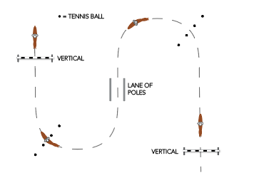 the course. - Fix your position. Almost any position exercise you can do on the longe line, you can do through this exercise because it’s so controlled. If you tend to sit and drive or if you do the opposite and perch, use this as an awareness exercise and make sure you are touching the saddle between the tennis balls and middle lane of poles, then get out of the saddle through the middle lane of poles, and the touch the saddle again between the middle lane and tennis balls. If you tend to pull on one rein to steer, ride it one-handed.