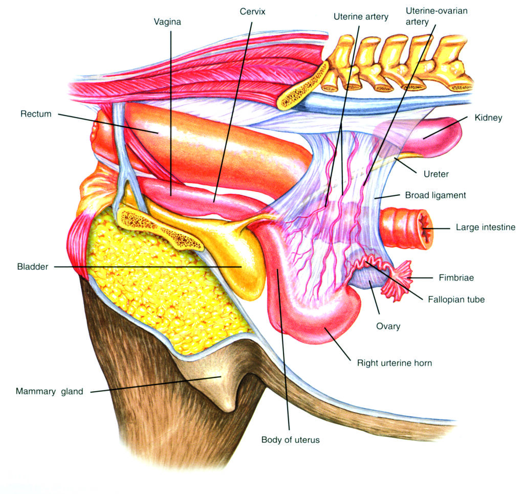 Spaying (ovariectomy) may be recommended in cases where intense ovarian pain cannot be relieved. The ovaries are surgically removed in a hospital setting with the mare under standing sedation. The procedure is expensive and carries some risk, such as hemorrhage and infection. In addition, although the mare will be permanently unable to conceive, she still may experience hormone-related behavior issues since estrogen is produced from sources other than ovaries, such as the adrenal glands.