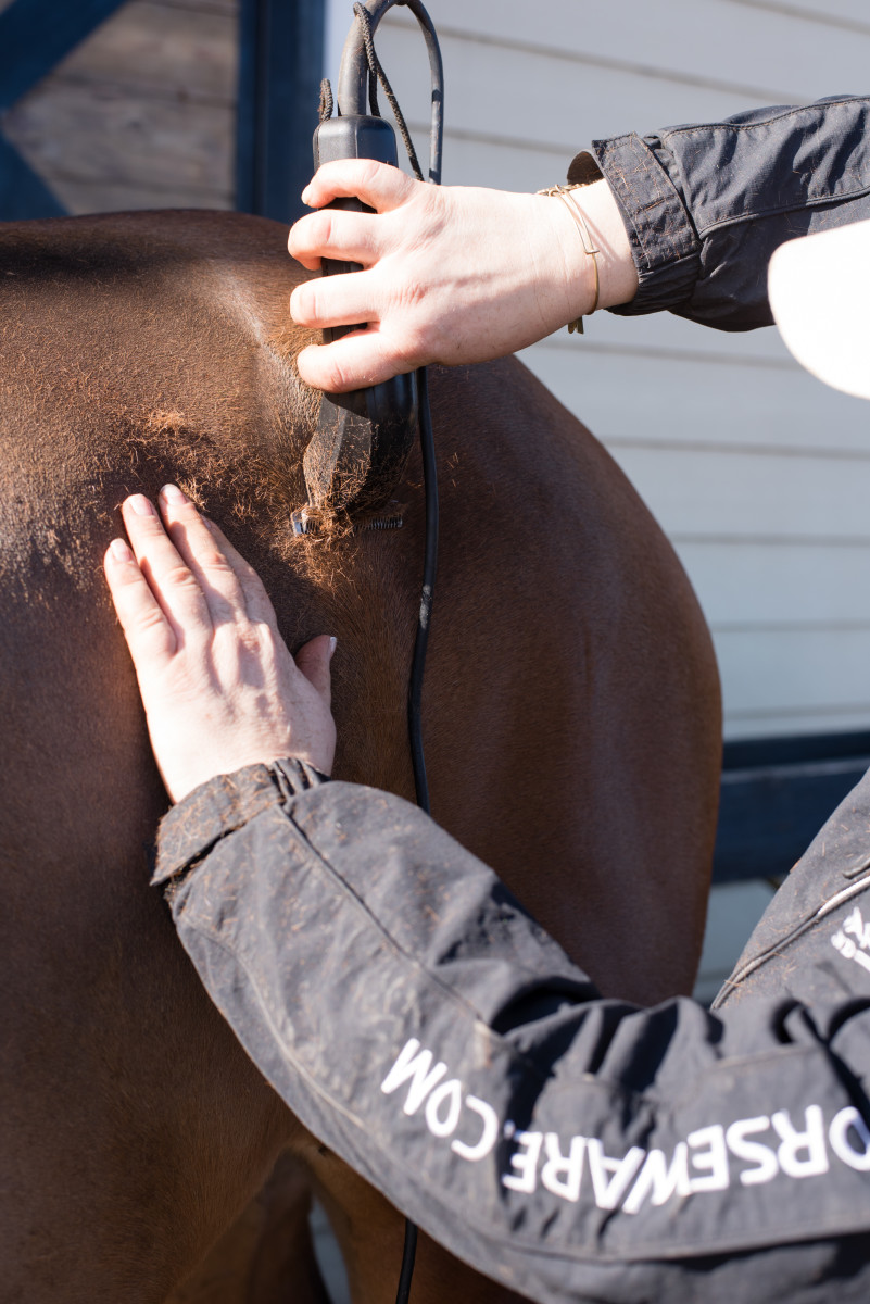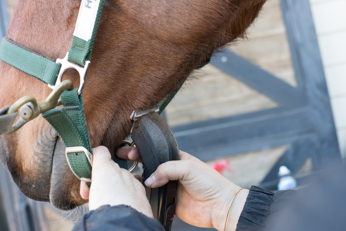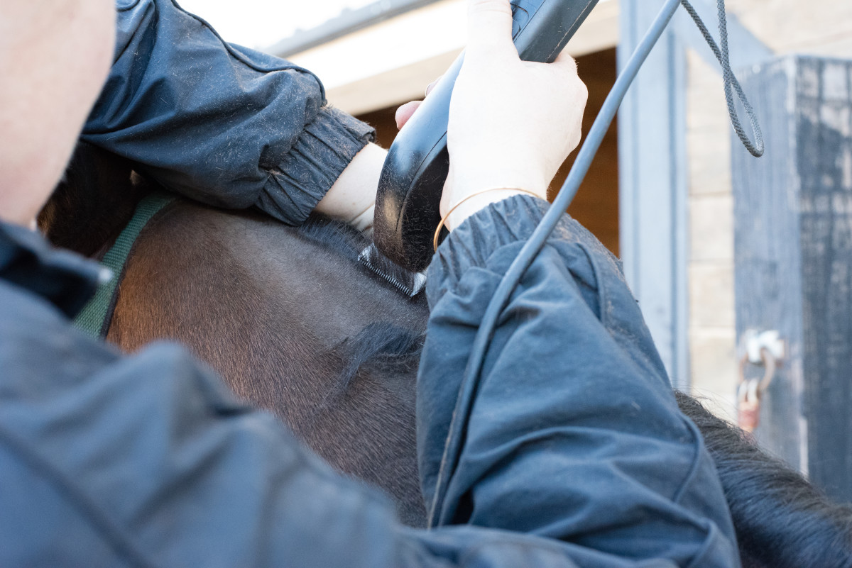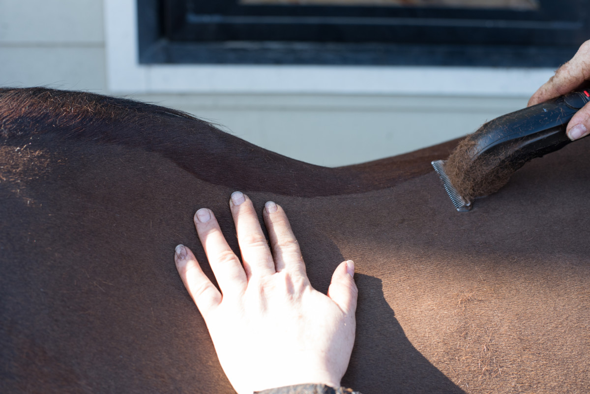 2. If you haven’t clipped your horse before, test his reaction to the body clippers by placing one of your hands on his side, turning on the clippers and pressing them against your arm. The vibration will travel through your arm and into his body. Watch his face to see how he reacts to the sound and feel. If he appears worried or agitated, proceed slowly with the next steps, taking extra special care around sensitive areas like the flanks