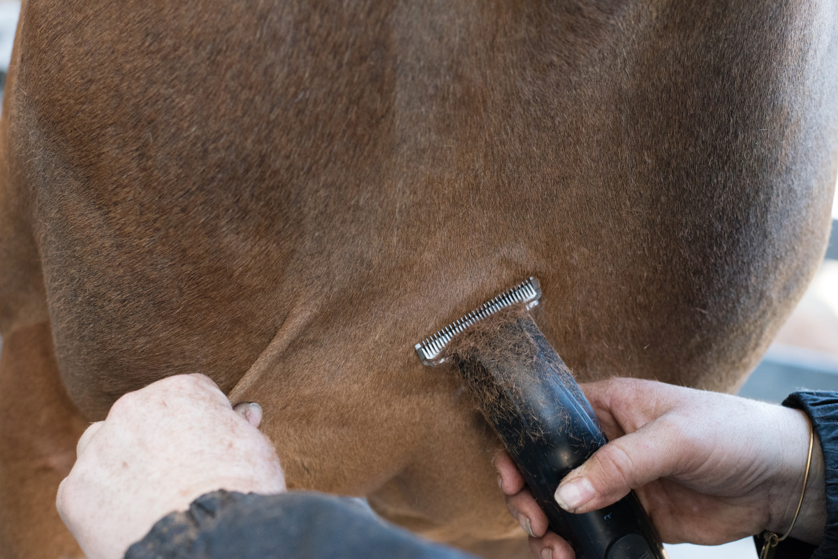 9. Wherever your horse’s skin is slightly loose, like around his elbows and stifles, there’s more chance of pinching or cutting it with the clippers. To avoid this, use your spare hand to stretch the skin taught while you clip those areas.