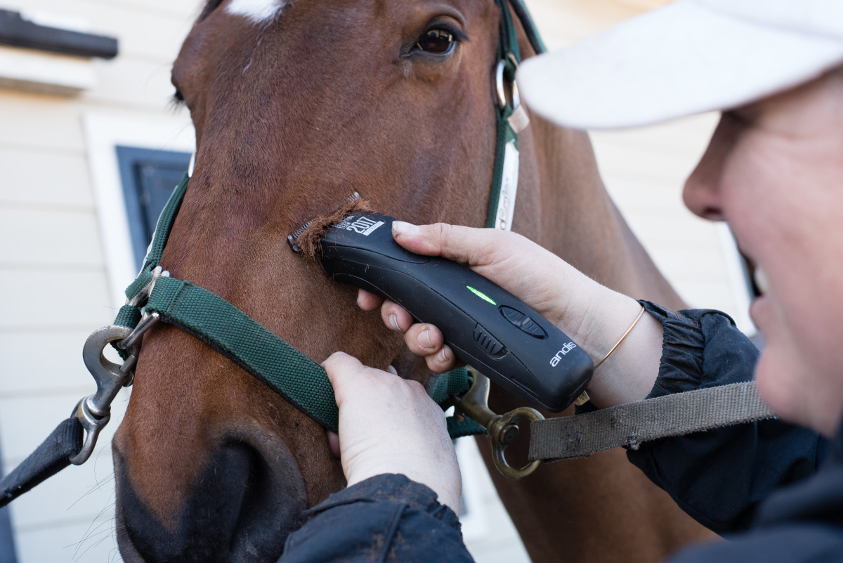 The best way to clip the face is with a grooming halter (a halter with no throatlatch). If you don’t have one, unclip the throatlatch of your regular halter and clip it to the ring on the other side to prevent it from swinging. If your horse is fussy about having his face trimmed, unfasten one of the cross-ties for this phase of the job. Use the same blade for the face that you used for the main body.