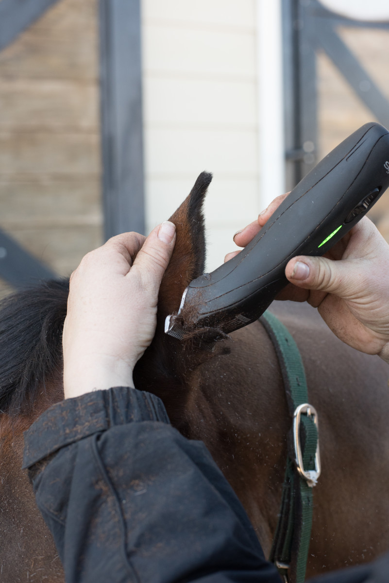 8. The result is a sharp, clean-looking ear. I prefer leaving the hairs on the insides of the ears unclipped to help protect them from bugs. If you do trim the hair out of the ears, be sure to put a fly mask on your horse whenever you turn him out.