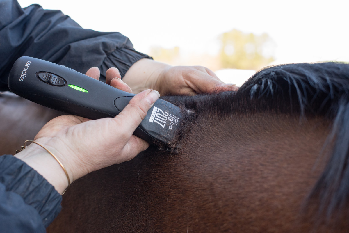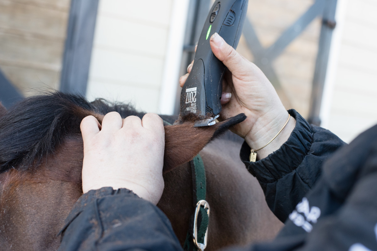 To give yourself the best chance at success, do this step from a mounting block, so you’re looking down on the mane, rather than up at it, while you clip. (Note how I’ve wrapped the cord safely around the back of the mounting block here.)