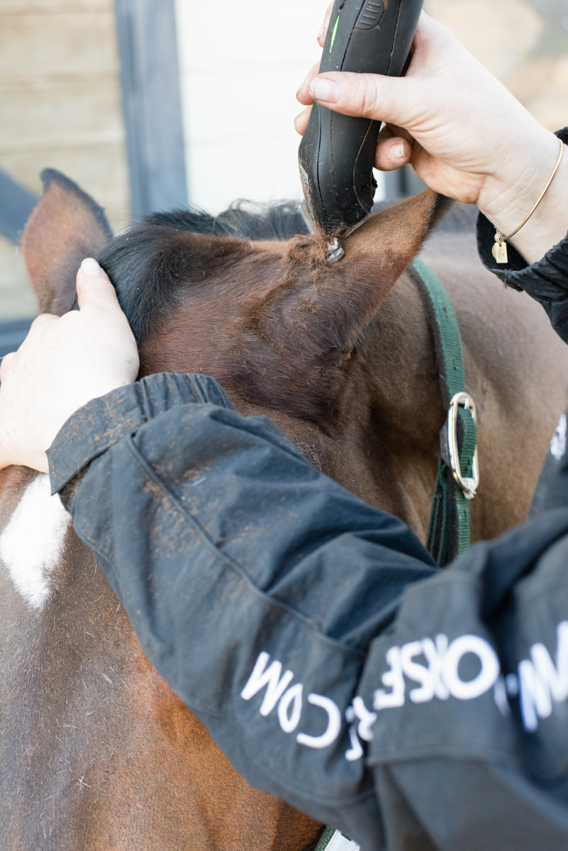 6. Still holding the base of the ear, clip the hair off the back of it. Holding the base of the ear helps to dampen the vibration of the clippers, making the sensation more tolerable for horses.