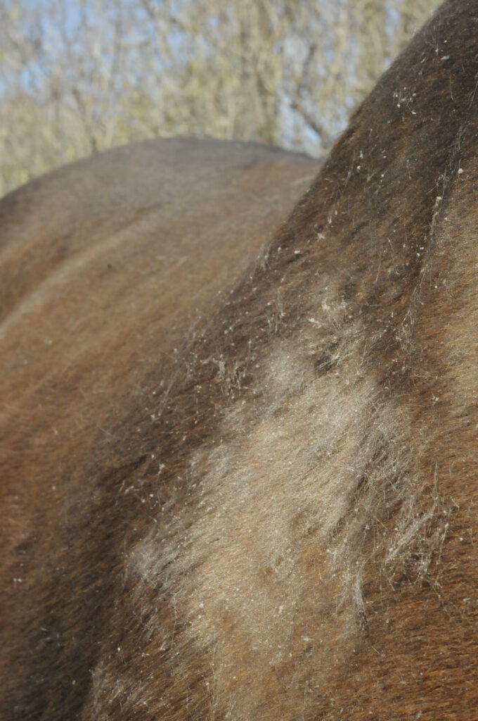 Individual lesions may appear in a spotty pattern across your horse’s body or they may coalesce into more expansive areas, leaving broad patches of bare skin. After the scabs and hair fall off, the skin underneath will appear red and raw. If the predisposing environmental factors are removed, the skin quickly re-epithelializes (heals)—usually within seven to 10 days—and new hair begins to grow in.