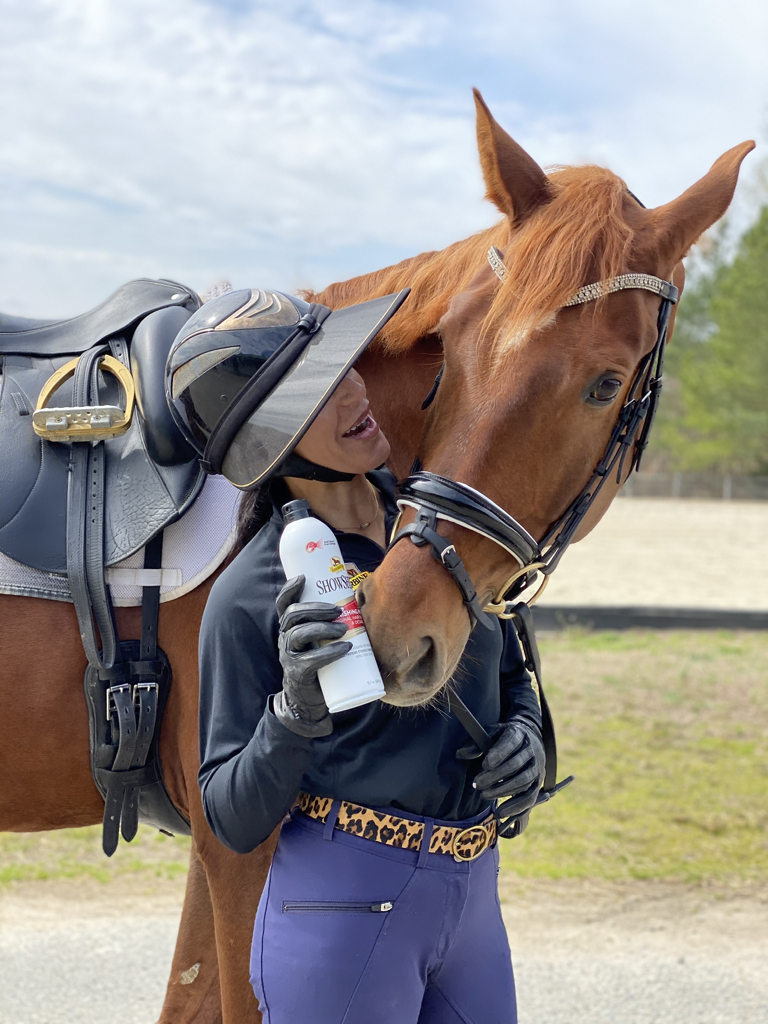 The spray is also useful at shows to help repel dust, dirt and shavings and to prevent stains from setting in. Plus, it’s especially beneficial for my horses with dark coats because its built-in UV protection helps prevent their coats from bleaching out during the summer.