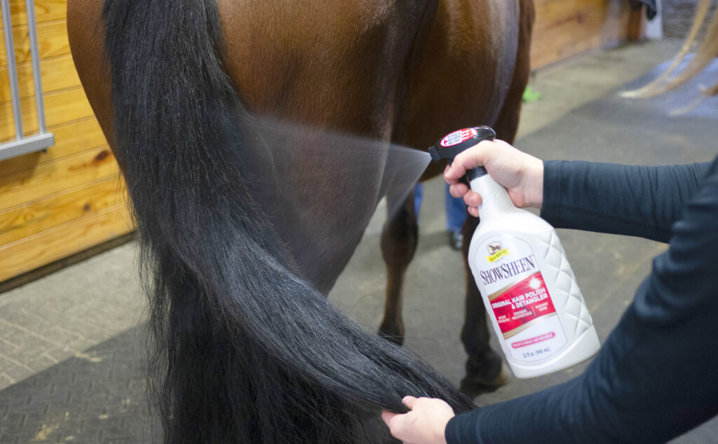 Once the hair is saturated with the detangler, I find it’s OK to use a wide-toothed comb or a brush designed for tails for any last tangles. The detangler helps soften and smooth down individual hairs to reduce breakage and create a healthier, fuller look for the show ring. I tend to give my horses’ manes the same treatment, but I don’t do it quite as often unless I’m heading to a big event.