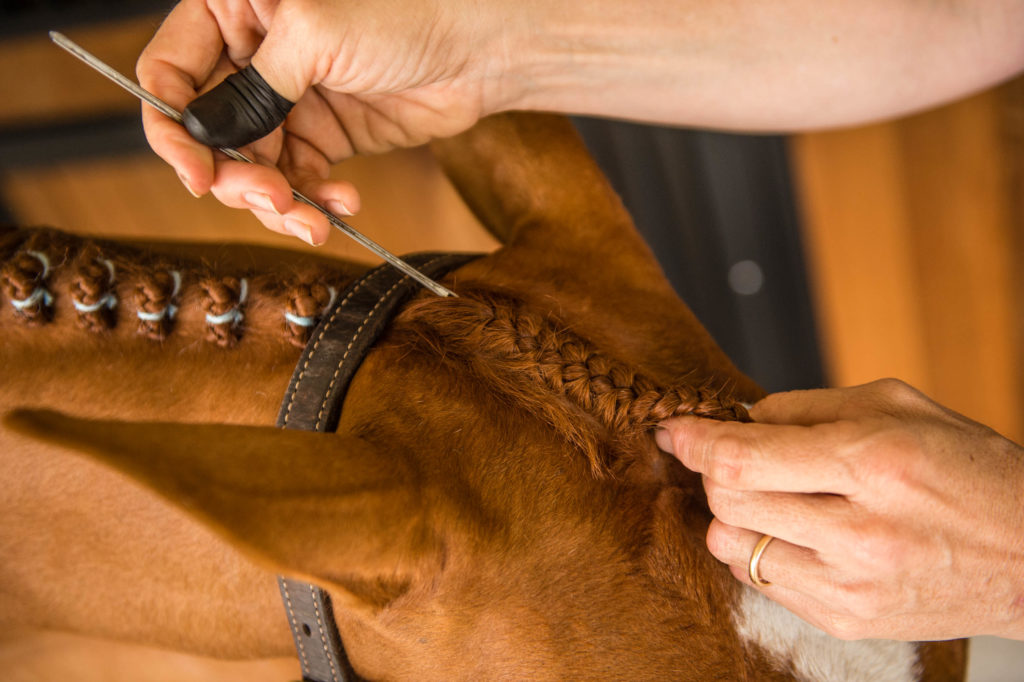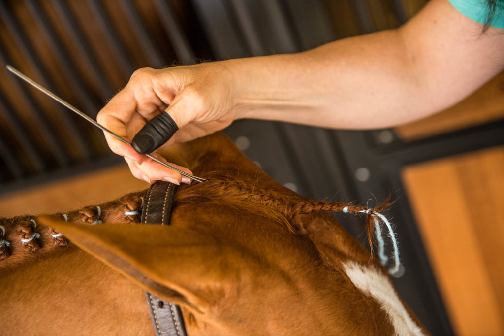 • Braiding needle: This tool is handy for pulling up thick forelocks, but a latch hook may also work if the forelock is very thin and small. You can order the braiding needles and latch hooks I use from Kelly Ward. I put them on a lanyard around my neck.