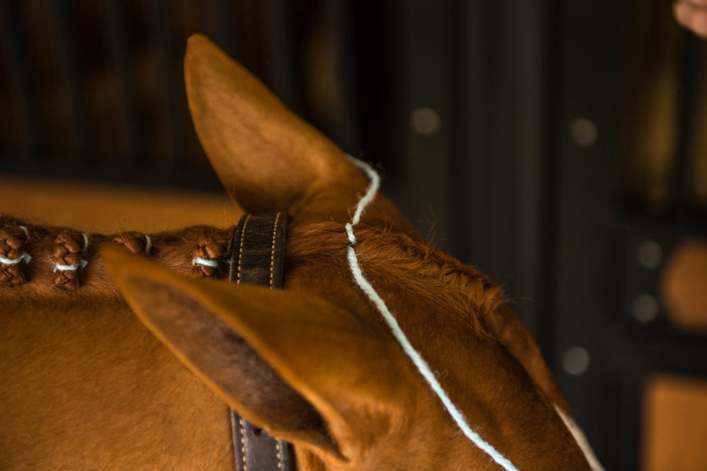 1. First, I wet the forelock the same way I wet the mane—with a wet sponge or Quic Braid—and then make a horizontal part at the top of the forelock. The size of each section of forelock on either side of the part will depend on the thickness of the forelock (some are tiny like a postage stamp, some are huge like a banana). Make a small section for a small forelock and a big section for a big, thick forelock. | Amy K. Dragoo2. Next, I separate this piece of mane into three sections. Then, just like regular braiding, make the first twist by crossing the right piece over the middle piece and then make the second twist by crossing the left piece over the middle. Then, on the third twist, I start incorporating loose hair from the bottom section of the forelock, taking a small piece of hair from the right side and weaving it into the braid, then a small piece of hair from the left side, weaving that into the braid. | Amy K. Dragoo3. Once all the loose pieces are incorporated, finish it like a normal braid, adding yarn under the braid two-thirds of the way down. At the end of the braid, loop the right piece of yarn around the underside of the braid and pull it tight. Then, with both pieces of yarn, tie a knot at the bottom, just as you did for the mane. | Amy K. Dragoo4. Instead of using a latch hook to pull up the forelock braid like I did for the mane, I use the braiding needle. If your horse has a tiny forelock, a latch hook might work, but sometimes it catches, whereas a braiding needle doesn’t catch and stays straight. Just like with the mane, find the “v” at the top of the braid. Working from the top, slide the braiding needle into the “v” and under the braid with the eye facing down. There shouldn’t be any resistance—if there is, it’s wrong. | Amy K. Dragoo5. I thread the yarn through the eye of the needle. | Amy K. Dragoo6. Then I slowly pull up the needle, bringing the braid up gently until the needle is totally out and the yarn is no longer in the eye of the needle. Two pieces of yarn will be hanging out of the top of the “v.” Make sure you don’t pull the braid too far up because it will be difficult to take it out later. Leave yourself something to grab. | Amy K. Dragoo7. Next, I poke the needle through the top of the braid horizontally from the left ear to the right ear. The eye should be sticking out toward the right ear. | Amy K. Dragoo8. Then I take the left piece of yarn, lay it in the eye of the needle and pull the needle back out the same way it went in to anchor the braid. For symmetry’s sake, you could do the same on the right side, but I usually just do the left. | Amy K. Dragoo9. I then tie three visible knots on top tightly. I make three knots so that I can cut the yarn closely to the braid without worrying that the braid will come out and there isn’t excess yarn at the top. | Amy K. Dragoo10. Once I’m finished braiding, I always use a Jammies brand hood to protect the braids. I also roll up the part of the Jammies hood that’s by the horse’s mouth and nostril to right below the cheekbone. | Amy K. Dragoo