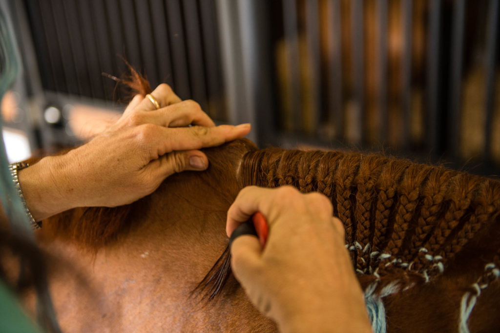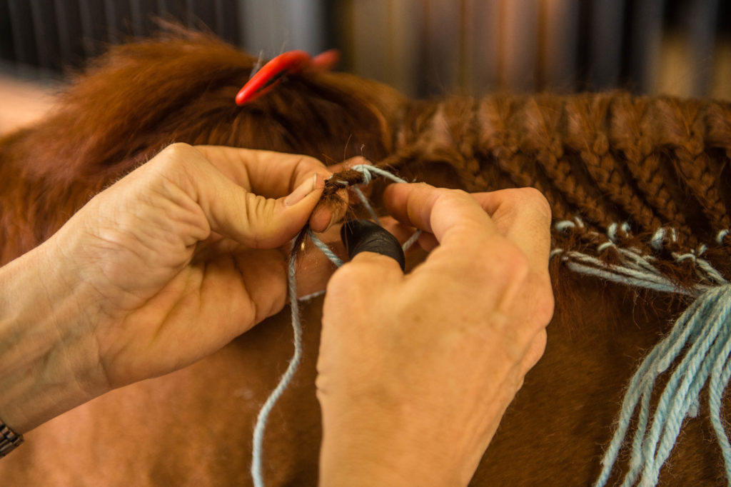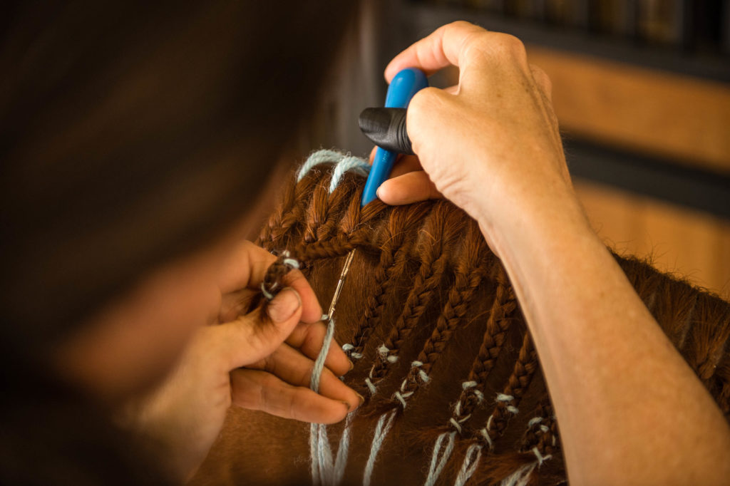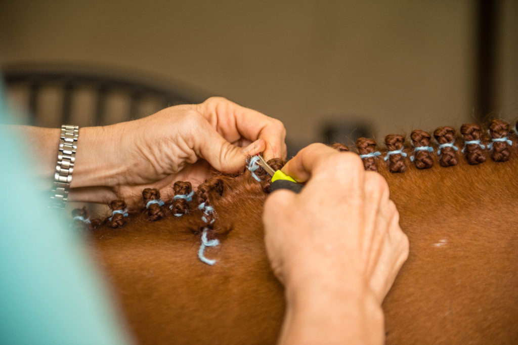 It’s also important to stay right in front of what you’re doing. As you braid, be careful you aren’t leaning to the side because unconsciously, you will make the braid crooked. Horses are always moving. It’s important that you move with them by moving your step ladder, not only to keep your braids straight but also so you aren’t putting unneeded strain on your own body, especially your back. Remember, braiding is all about practice. It might take many repetitions to get the feel for it.