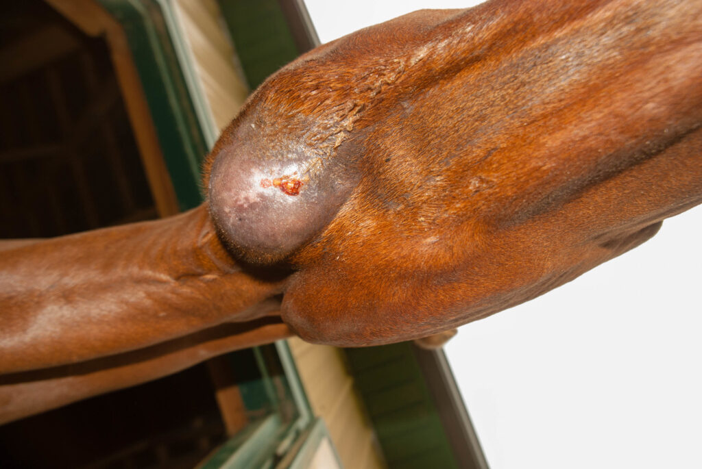 Strangles: Strangles, caused by Streptococcus equi bacteria, is common and highly contagious. Early signs include fever, depression and cough, followed by swelling of the lymph nodes around the horse’s jaw and throatlatch. Soon a discharge of pus begins draining from the horse’s nose. Abscesses may form in the lymph nodes and burst open to drain. Occasionally the bacteria spread to lymph nodes elsewhere in the body and there can be serious complications. Young horses are often hardest hit.