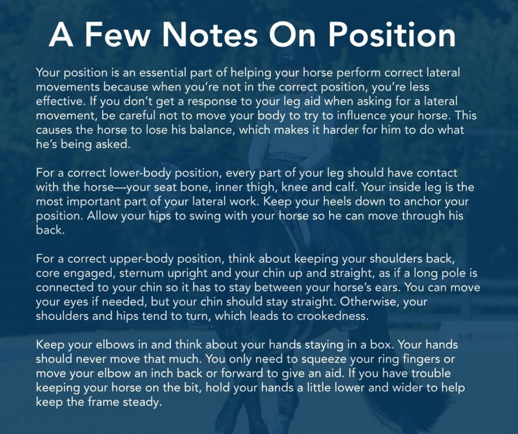 The biggest mistake I see in lateral work is riders often lose the shape of the horse. The horse has a harder crossing side and an easier crossing side, so the haunches either swing over or the shoulders fall to the outside, and the control of the sideways motion is lost. Think about staying in a rhythm and holding the shape by using your inside and outside aids together to help move and balance your horse. You want to keep a steady bend and connection with even steps throughout the whole movement.