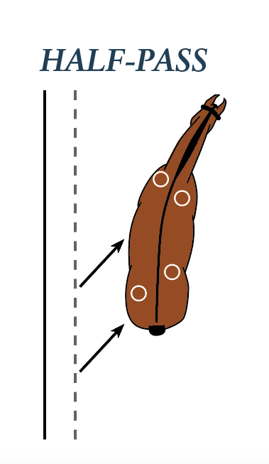 For a horse learning half-pass, keep it very shallow and easy. I like to start on the quarter line with all horses because it gives you a little space to play. Think about the diagonal line going from the quarter line to the center line, so about five meters or even less, and do two to three steps of half-pass. It’s better to have a few great steps than a lot of bad ones. Once you get a few good steps, go straight for a couple of steps, then go back to moving sideways. As your horse becomes more advanced, you can increase the difficulty by making the half-pass steeper, longer and with more collection and impulsion.